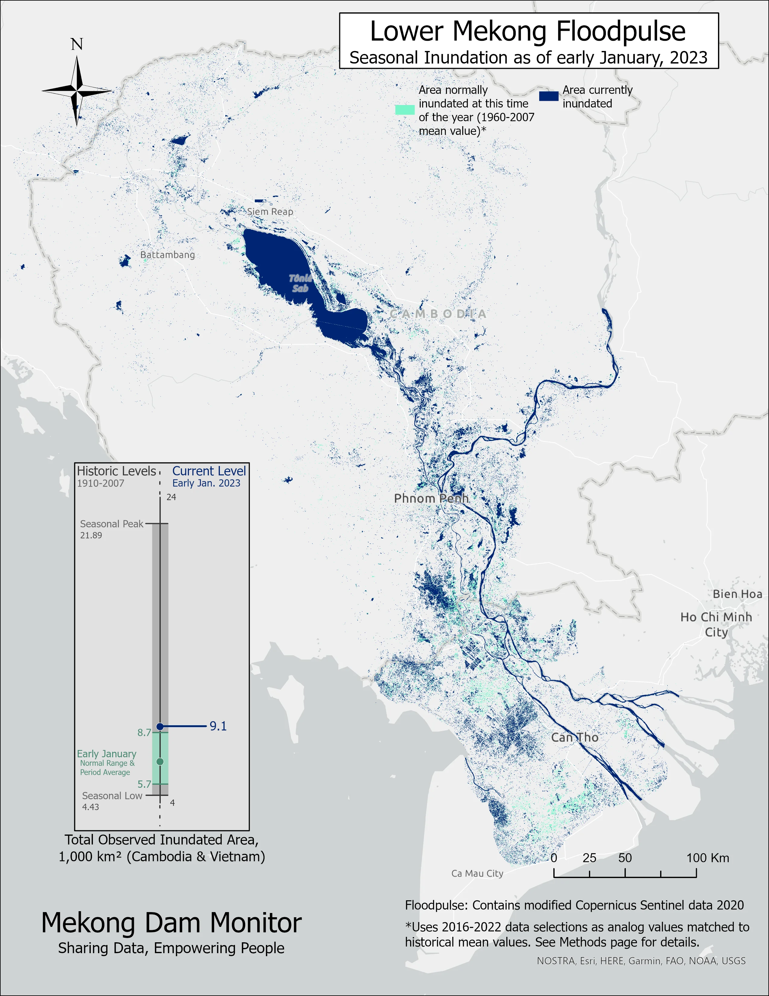 Tonle Sap's dense flooded thickets provide complex habitat for fish when flooded, but store less carbon than gallery forest. Dry season forest fires, particularly in the warm El Niño years of 2015 and 2016, destroyed large areas of flooded forest and scrub.